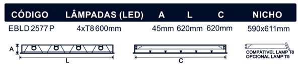 Instalação: Embutir em forro modular, gesso, PVC, etc;