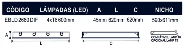 EBLD 2680 DIF 4×600 LUMINÁRIA EMBUTIR COM DIFUSOR EM PS LEITOSO SEM REFLETOR